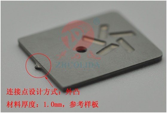 內凹試連接點設計主要是應用于功能性產品,毛刺凹于產品的邊緣,不影響產品的功能。材料的厚度不同連接點的大小也不同,材料越薄,金屬蝕刻連接點越小,材料越厚,蝕刻連接點越大!厚度在0.2mm以下的,,內凹的寬度在0.5mm,內凹的深度在0.15mm內! 一般產品都會選擇這種內凹的方式, 部分客戶還會對連接點的大小有相關要求!