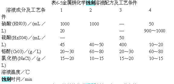 蝕刻不同的金屬要采用不同的溶液配方及工藝條件,常用金屬材料的蝕刻溶液配方及工藝條件見表6—4~表6-6。